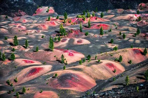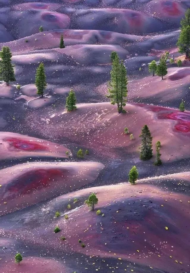 In Lassen Volcanic National Park in the United States, the sand dunes on the slopes of the volcano appear in splashes of color. This is the result of volcanic activity and is breathtakingly beautiful. The scene looks like an oil painting, God's painting.