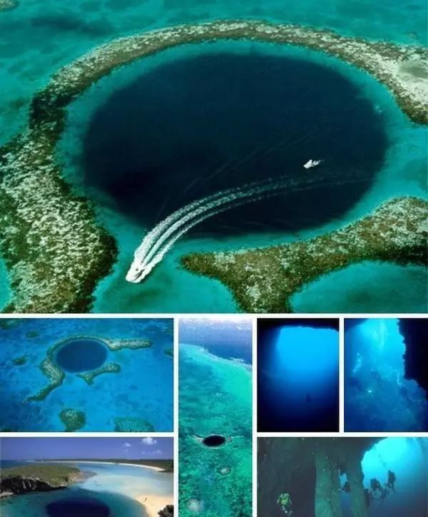 The Great Blue Hole, Belize. These huge underwater caves were formed during the distant Ice Age, when sea levels were quite different from today and much of the seafloor was still exposed at the surface. The Blue Hole was probably formed by erosion at the time and then filled with seawater.
